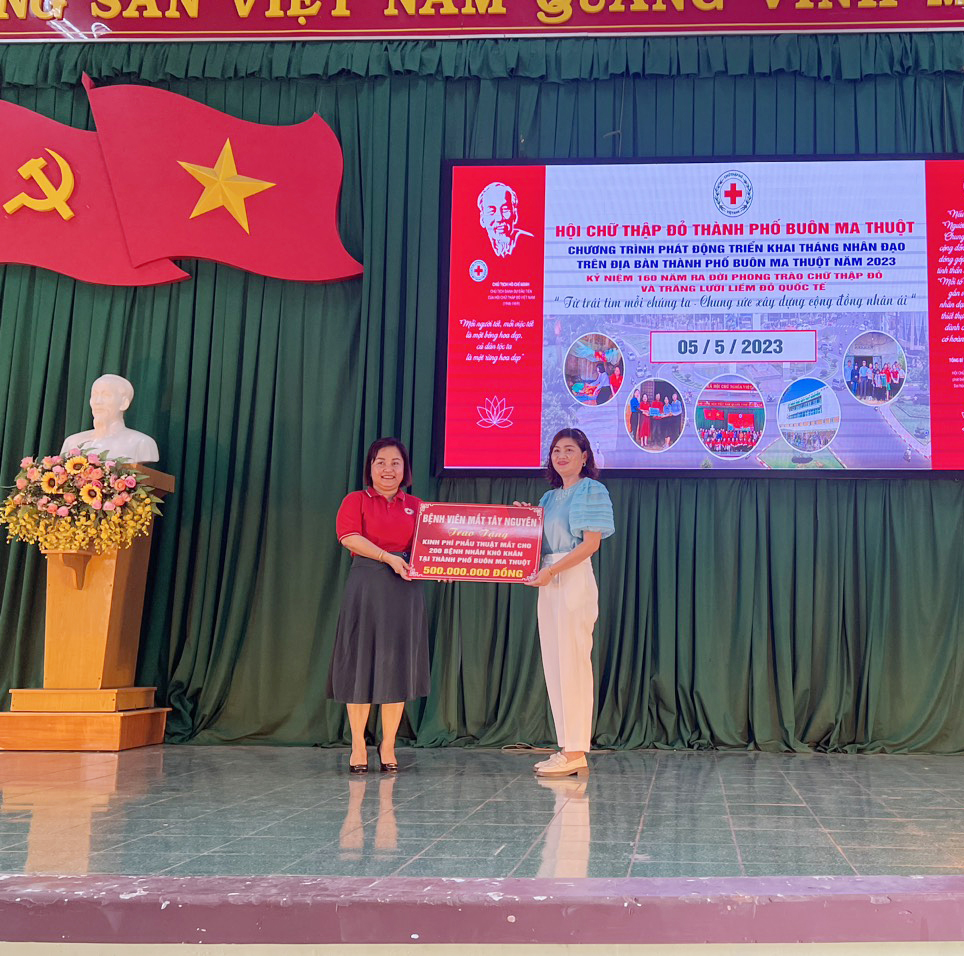 Với chủ đề: "Người tốt, việc thiện - chung sức xây dựng cộng đồng nhân ái". Lãnh đạo, nhân viên BVMTN đã trao tặng kinh phí khám sàng lọc và phẫu thuật mắt miễn phí cho 200 người dân khó khăn trên địa bàn thành phố Buôn Ma Thuột số tiền 500.000.000 đồng.