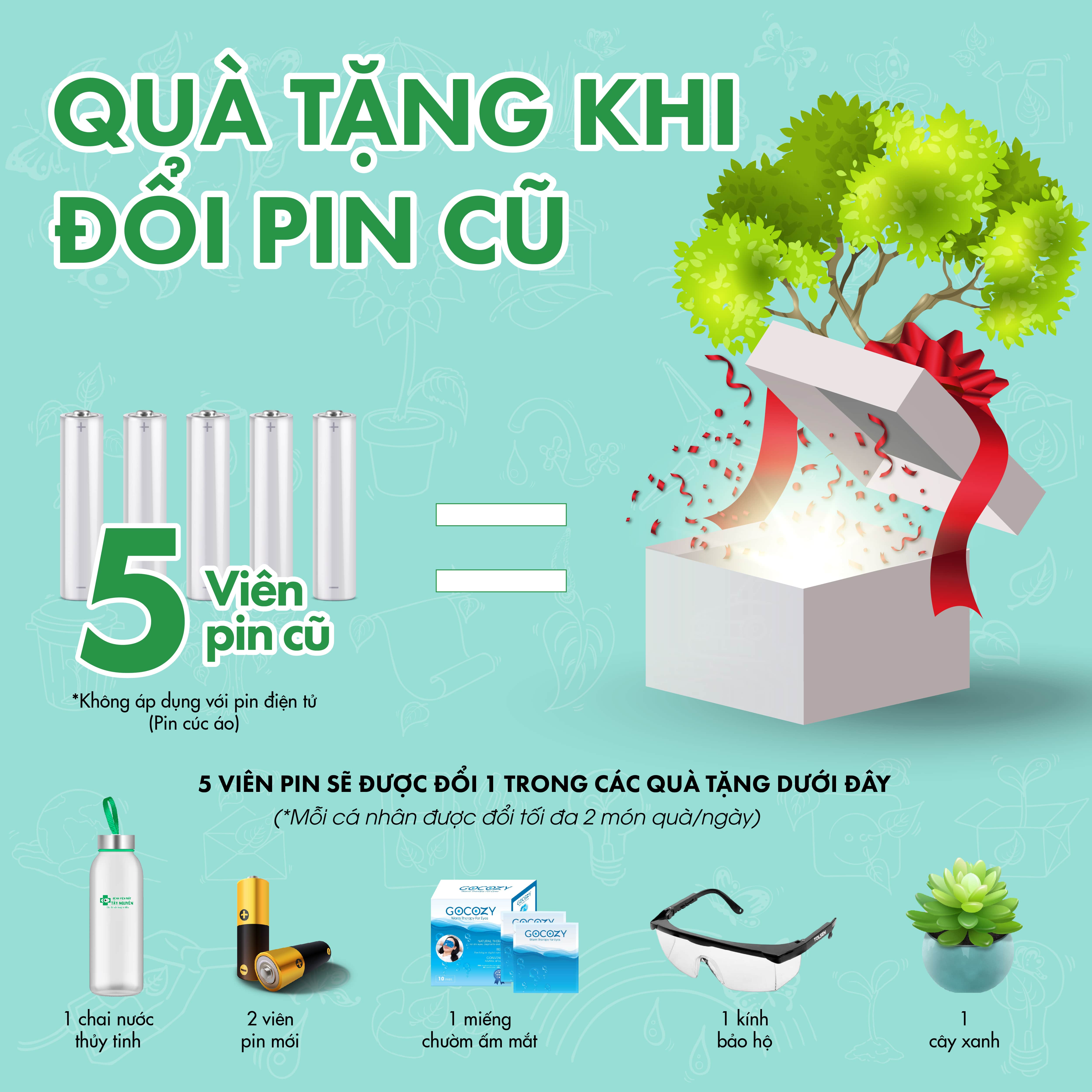 - Khi đổi 05 VIÊN PIN CŨ sẽ được chọn 1 trong các quà tặng sau:
