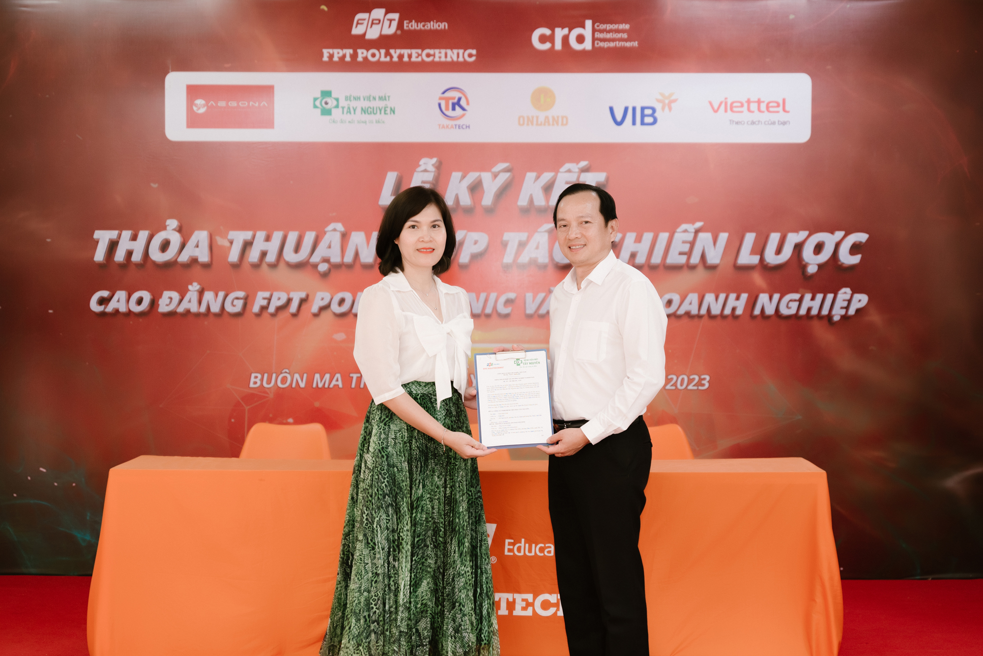 9h sáng ngày 07-04-2023. Tại buổi lễ ký kết thỏa thuận hợp tác chiến lược Cao Đẳng FPT Polytechnic và Bệnh Viện Mắt Tây Nguyên, đại diện lãnh đạo hai đơn vị, đã cùng ký kết bản thỏa thuận định hướng các nội dung hợp tác giữa hai bên. Trường Cao Đẳng FPT Tây Nguyên và Công ty TNHH Bệnh Viện Mắt Tây Nguyên sẽ phối hợp triển khai bố trí nhân lực, thời gian và cơ sở vật chất để tiếp nhận sinh viên của Trường đến thực tập và hỗ trợ thực hiện đề tài tốt nghiệp, bên cạnh đó, ưu tiên tuyển dụng sinh viên do Trường đào tạo, có thực tập tại Công ty.